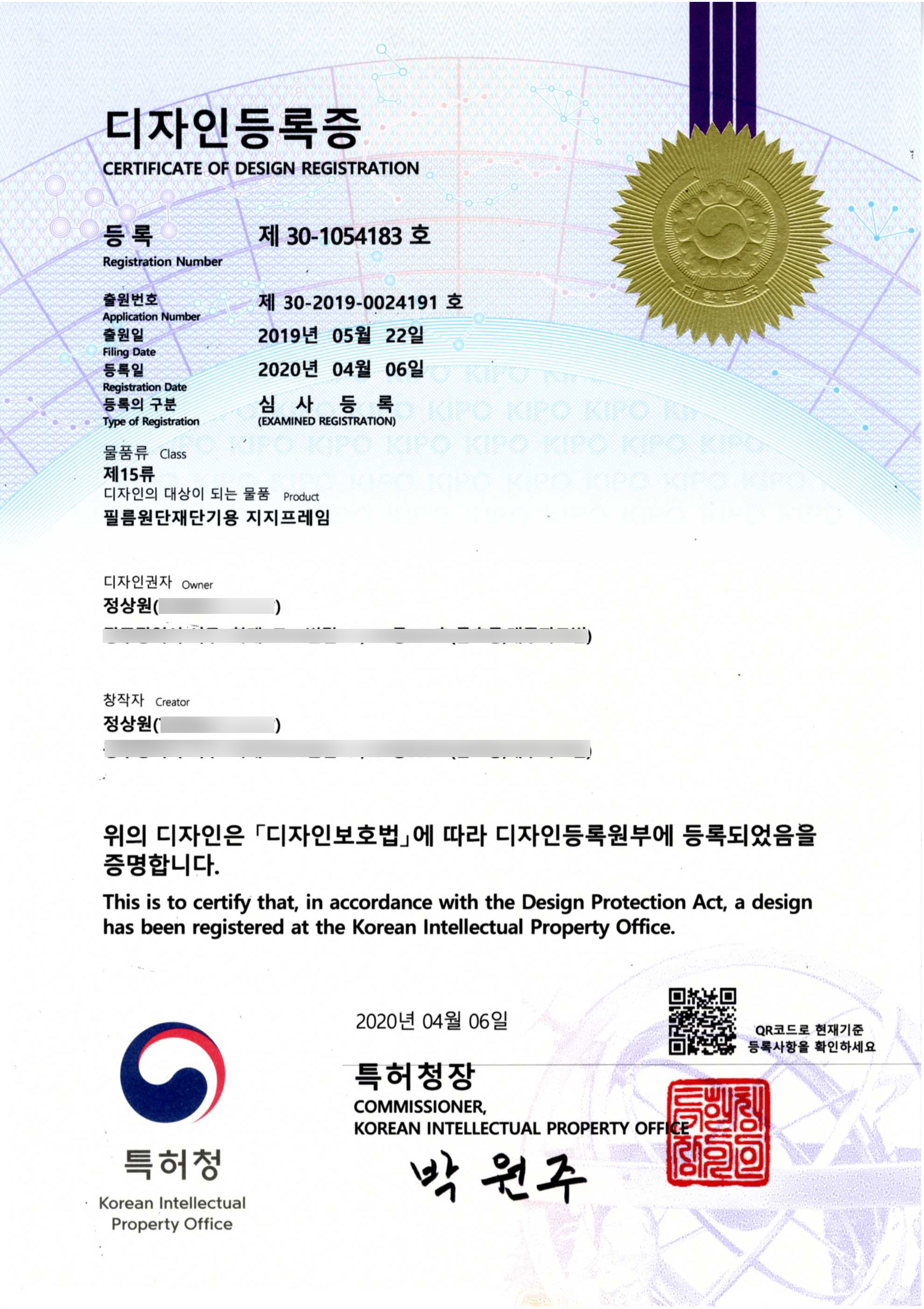 디자인등록증(필름원단재단기용 지지프레임)