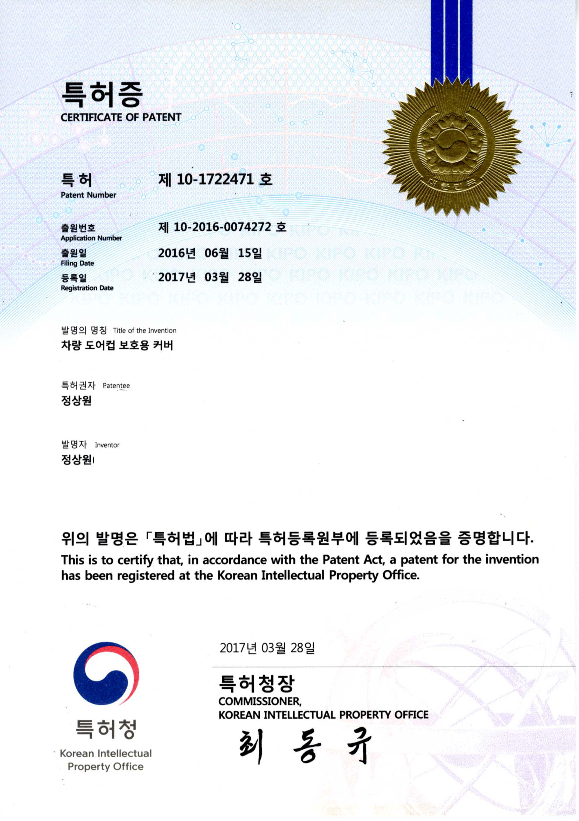 디자인등록증(차량 도어컵 보호용 커버)